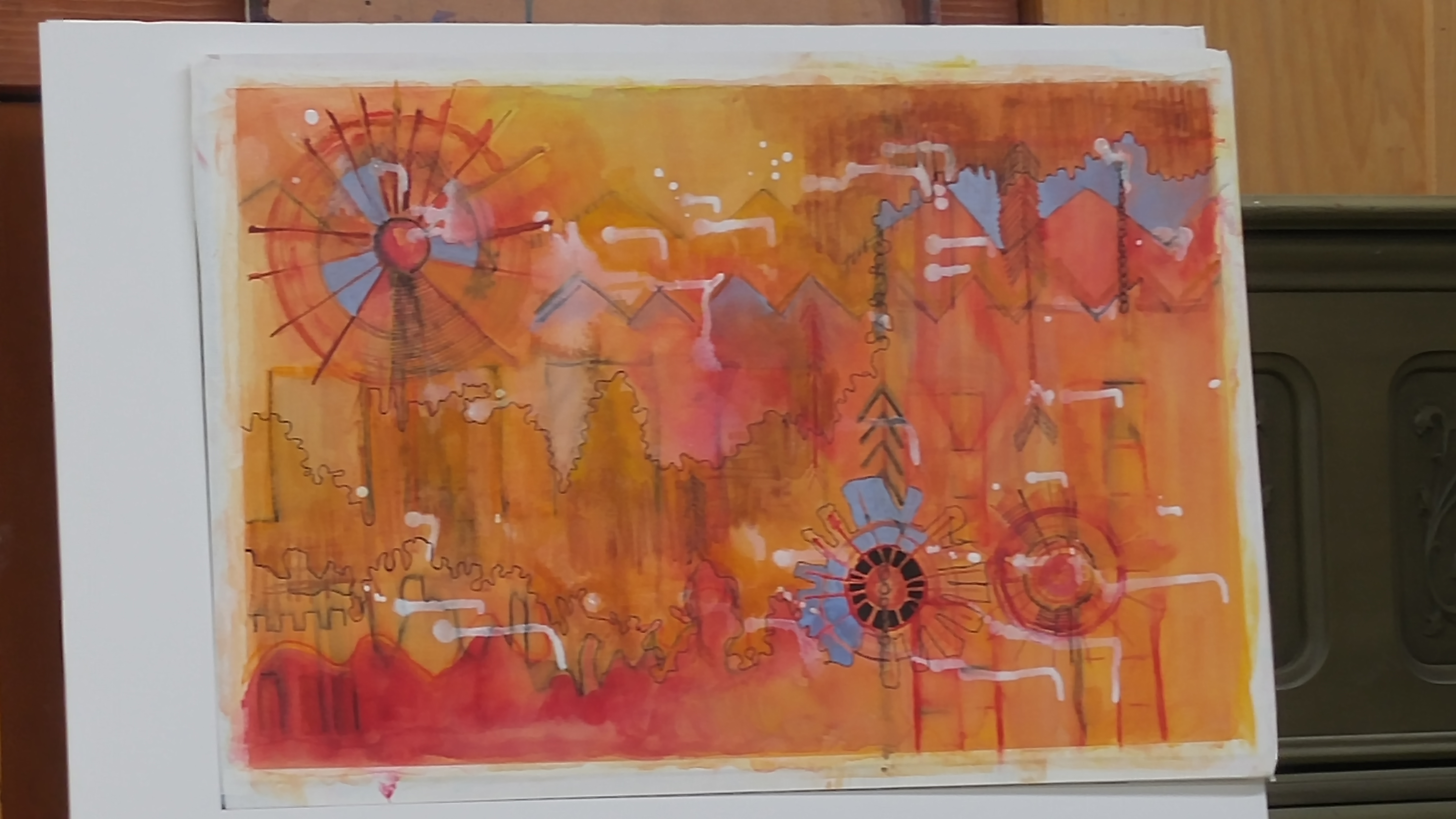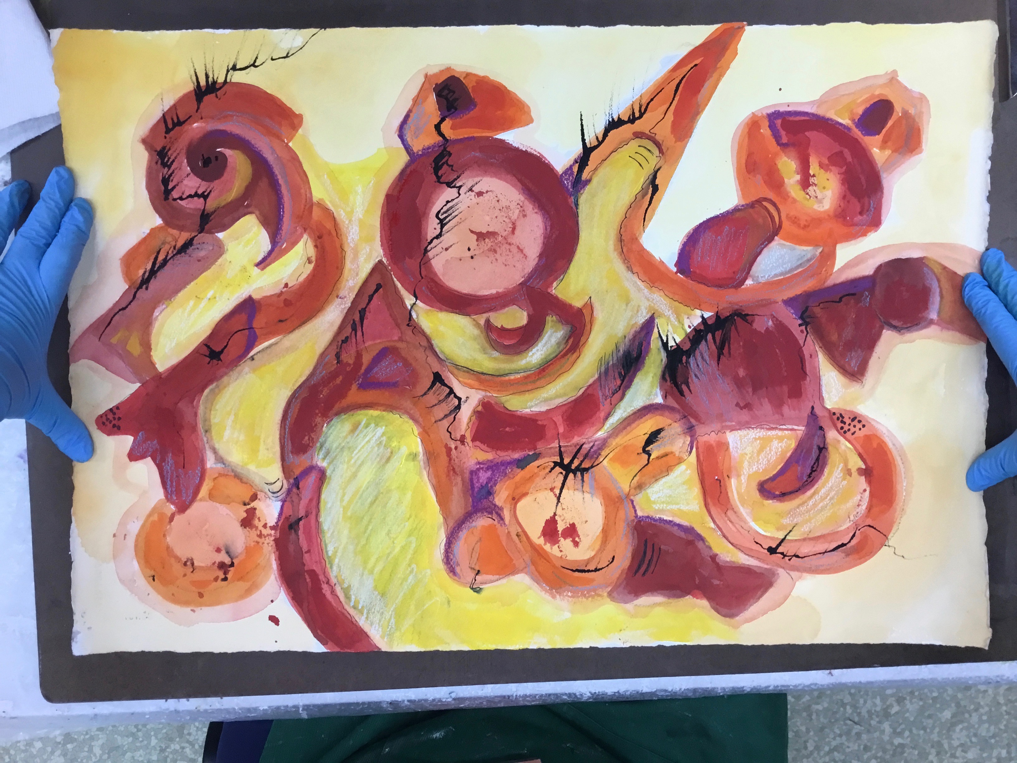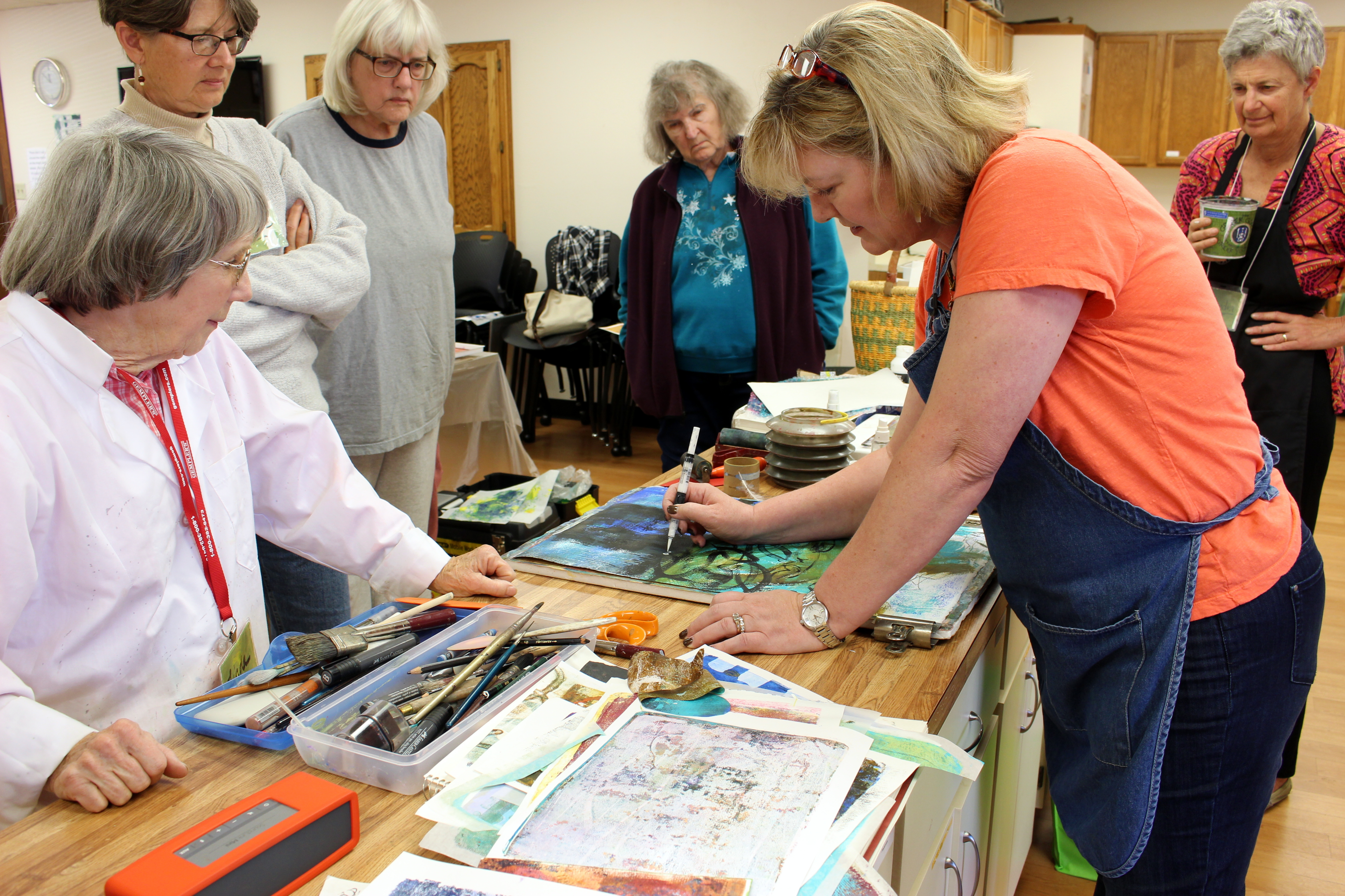 Deftly weaving the elements of design into her visual presentations, Ruth then demonstrated techniques with which to develop sketches, photos, drawings, and failed paintings – through several iterations – into a finished work. She used a myriad of methods and materials, something to appeal to all participants. From gouache to Gelli pads, we explored ways in which we can resolve pauses and hiccups in our work.