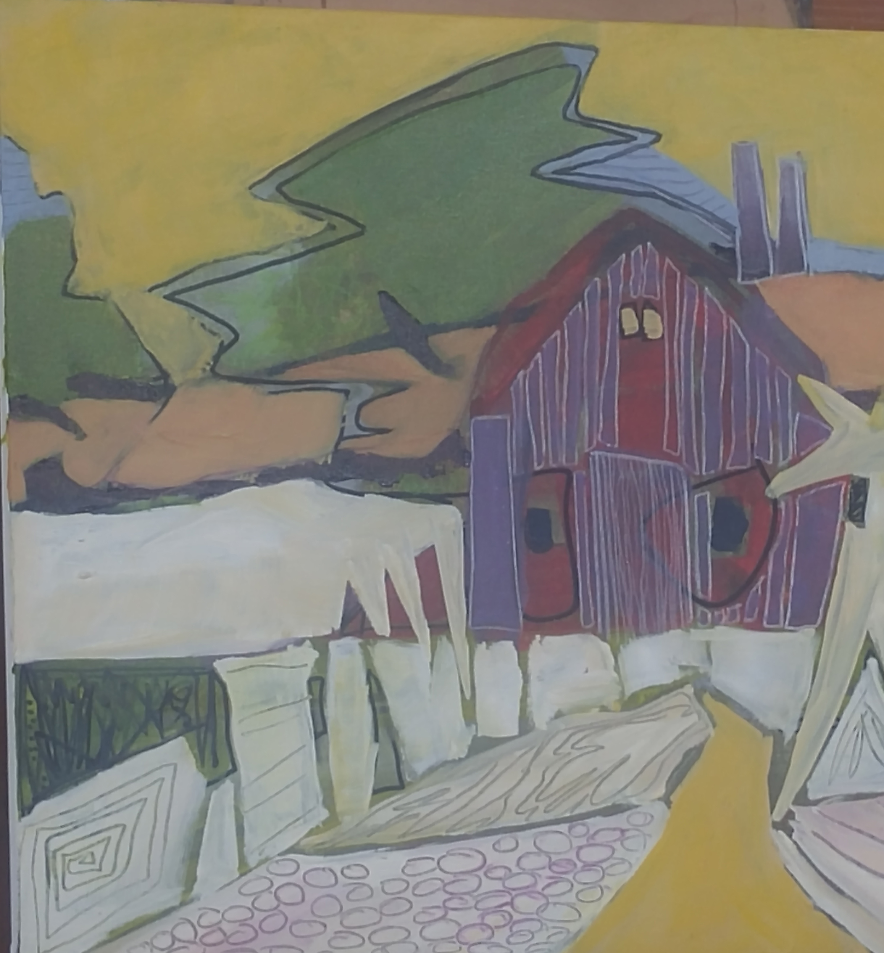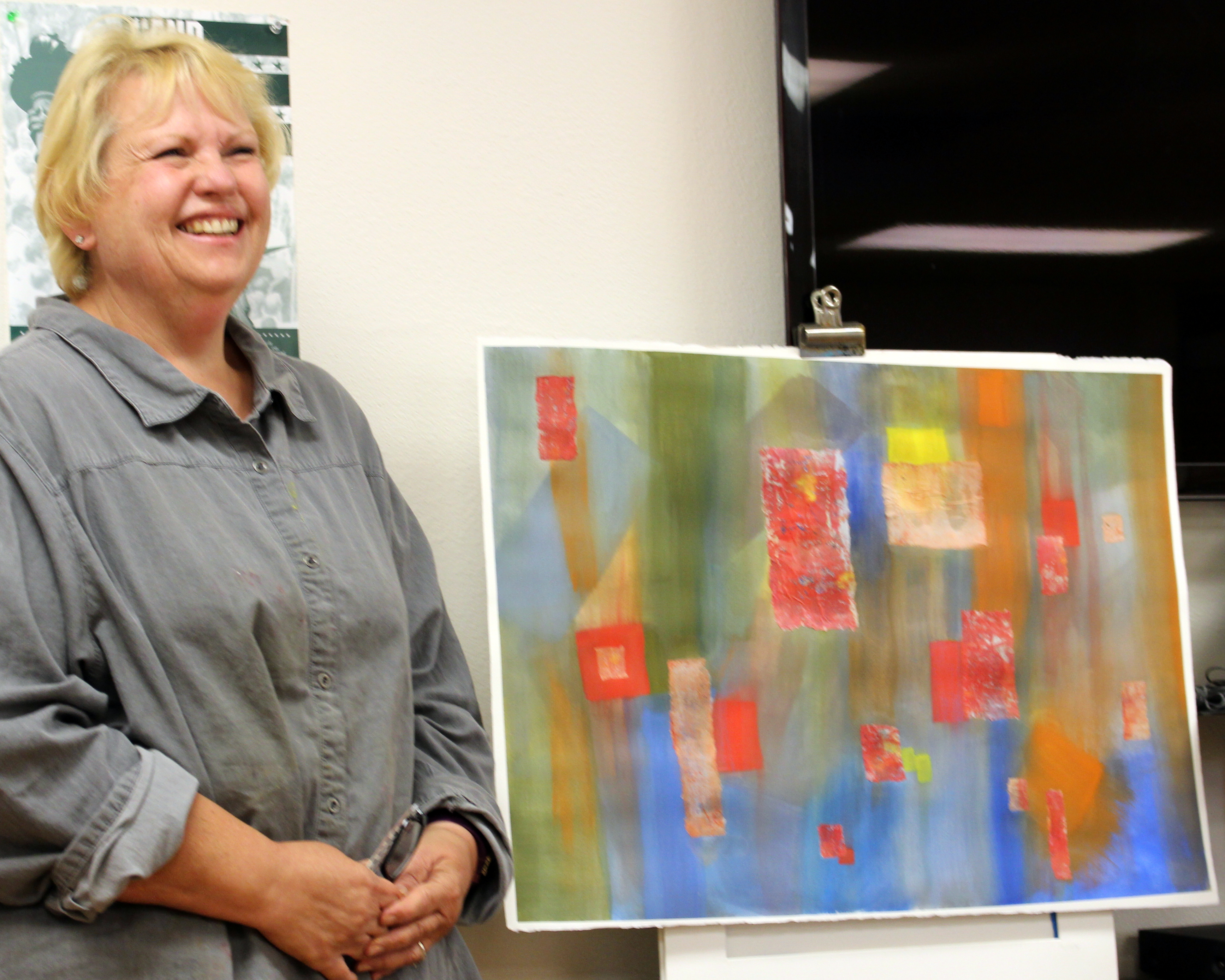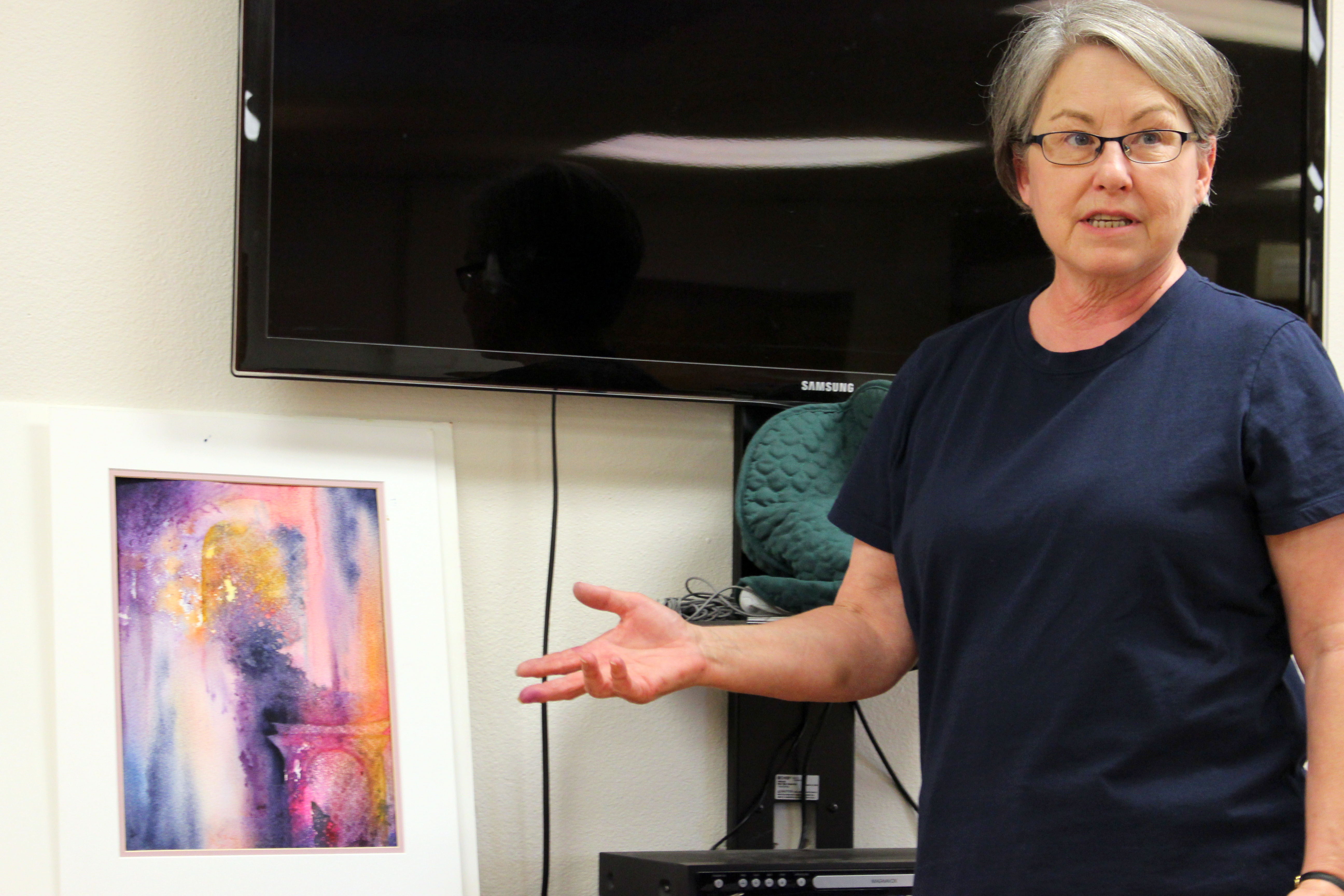 Deftly weaving the elements of design into her visual presentations, Ruth then demonstrated techniques with which to develop sketches, photos, drawings, and failed paintings – through several iterations – into a finished work. She used a myriad of methods and materials, something to appeal to all participants. From gouache to Gelli pads, we explored ways in which we can resolve pauses and hiccups in our work.